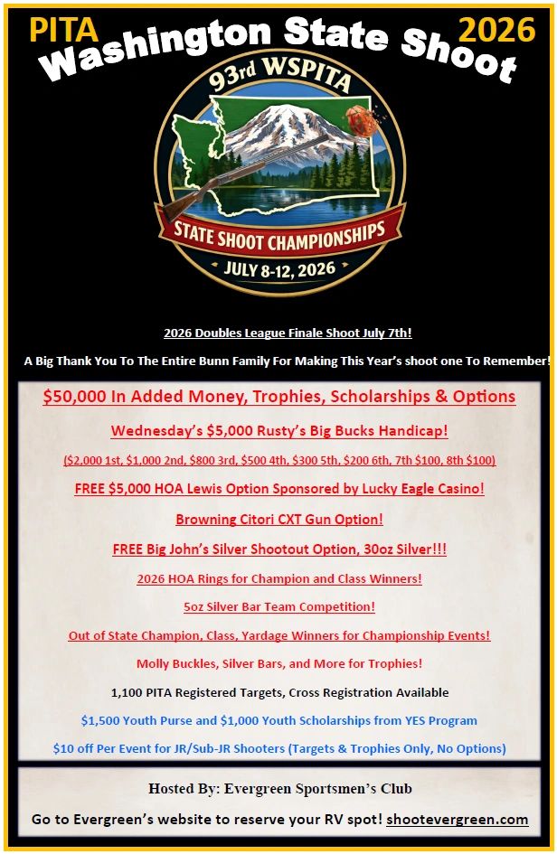 Last video for our 2025 Washington State Shoot! We hope to see everyone there July 8th-13th at Evergreen Sportsmen's Club! $40,000 in added money, trophies, scholarships, and options!